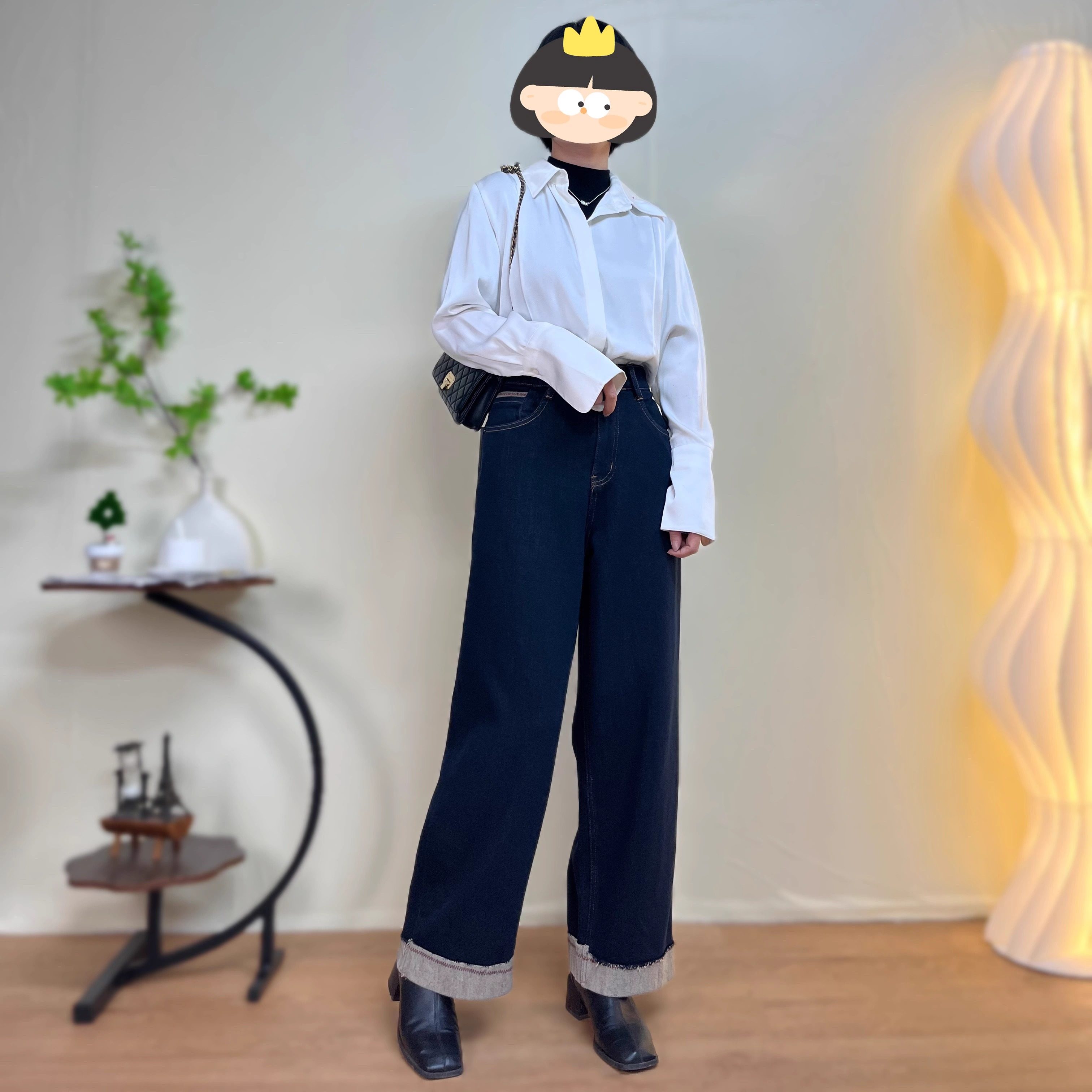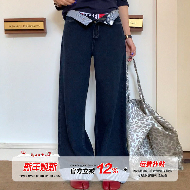 十一石 重工翻边设计 复古高腰直筒阔腿牛仔裤女小个子宽松长裤ll