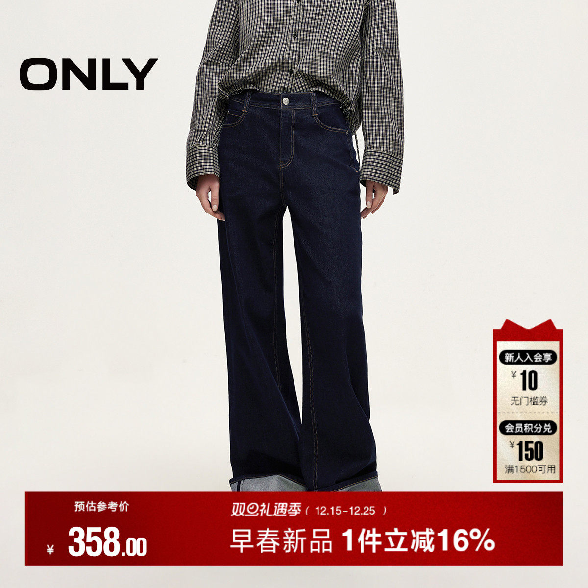 ONLY2025冬季新款复古高腰显瘦磨白水洗裤口翻边直筒长裤牛仔裤女