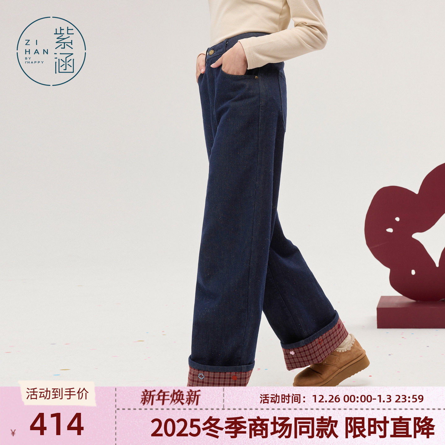 紫涵蓝色直筒牛仔裤女2025年冬季新款翻边格纹加绒保暖高腰休闲裤