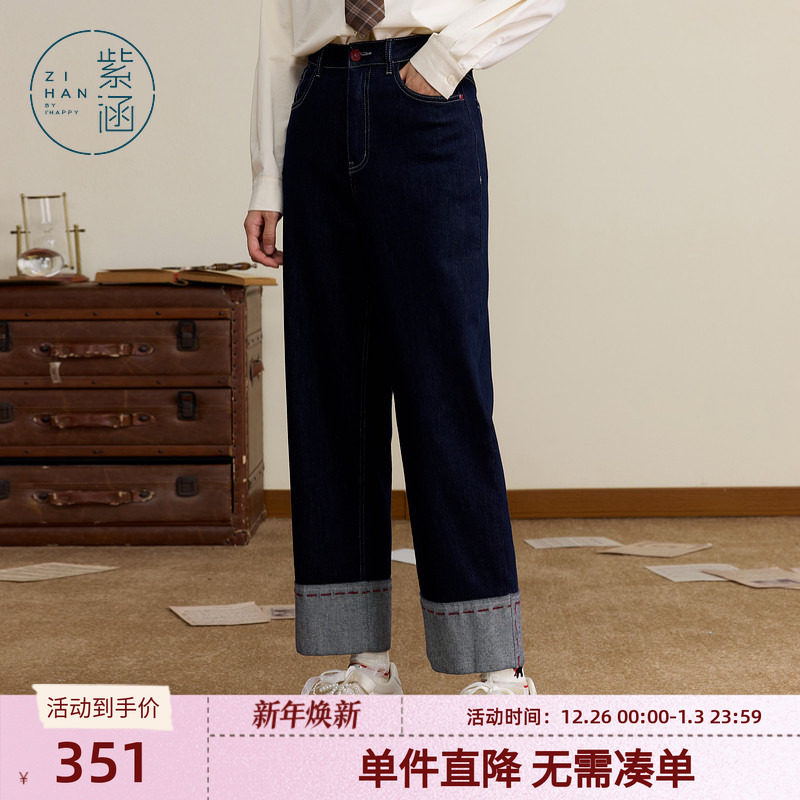 紫涵撞色翻边直筒牛仔裤女2025年秋季新款复古高腰显瘦百搭休闲裤