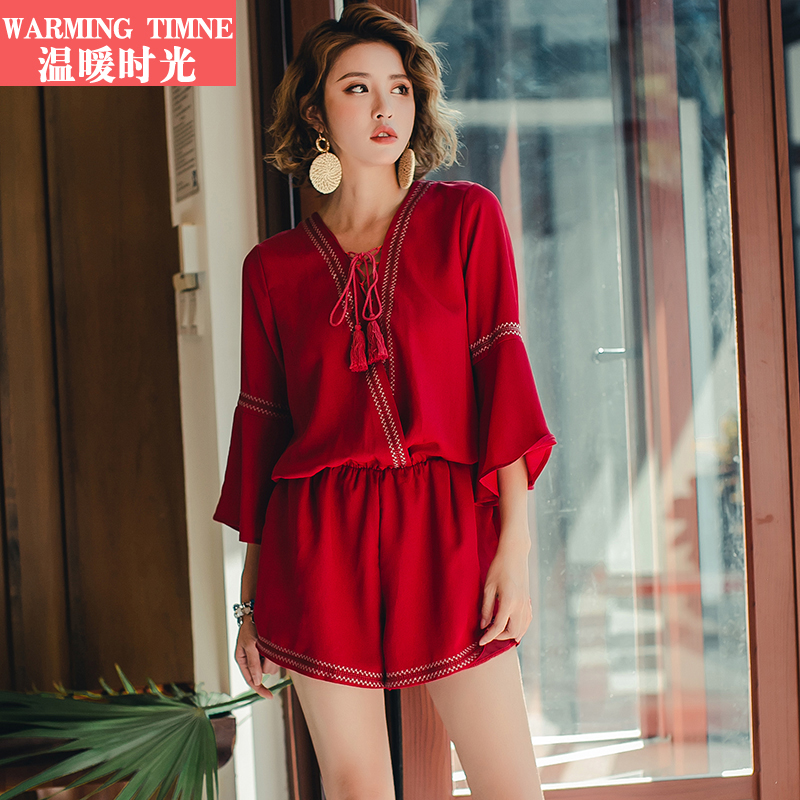 沙滩裙裤海边度假新款夏女波西米亚刺绣连衣阔腿裤泰国连体裤短裤