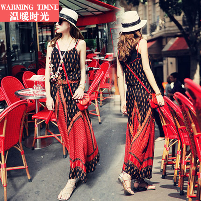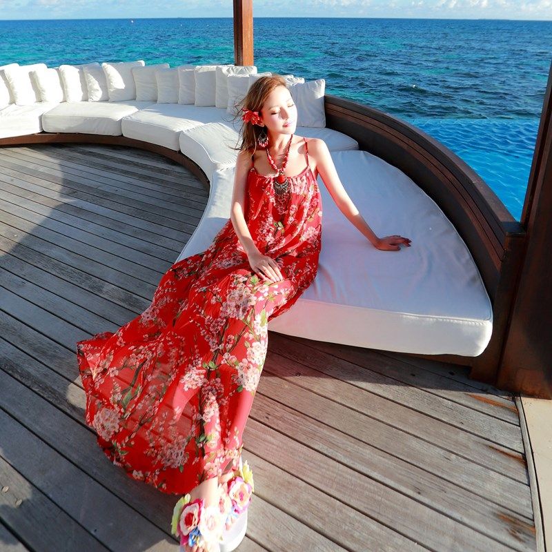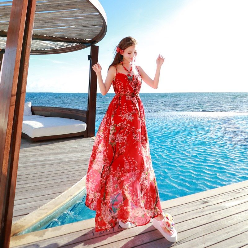新款夏季泰国海南三亚度假连衣裙海边大码沙滩裙女装碎花吊带长裙