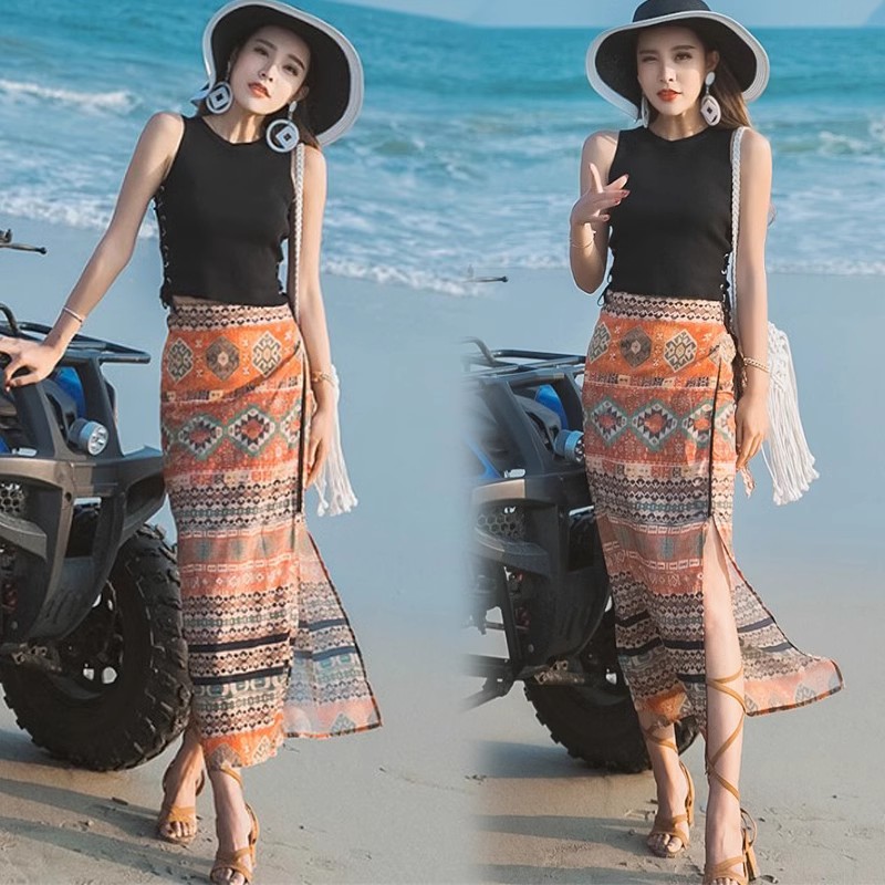 波西米亚沙滩裙民族风复古半长裙一片式高腰开叉泰国花半身裙子女