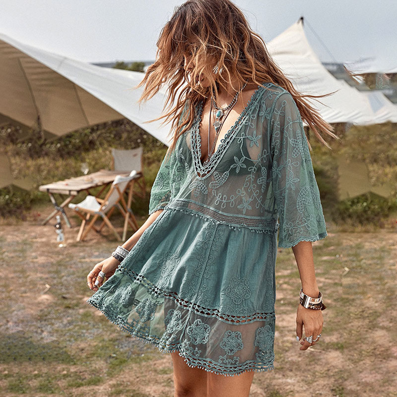 2025新款欧美泰国三亚旅游大码显瘦蕾丝连衣裙海边度假沙滩短裙子