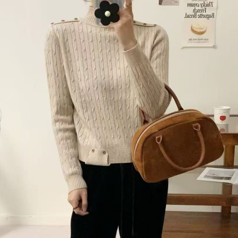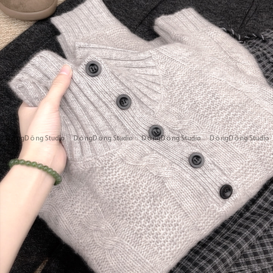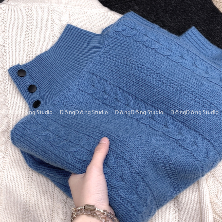 秋冬麻花新款纽扣高领毛衣女宽松外穿慵懒套头加厚针织针织衫上衣