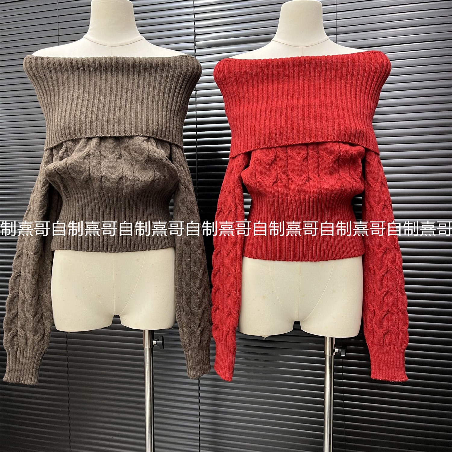 【TiTi美少女】复古纯欲麻花高领套头毛衣露肩针织衫宽松长袖上衣