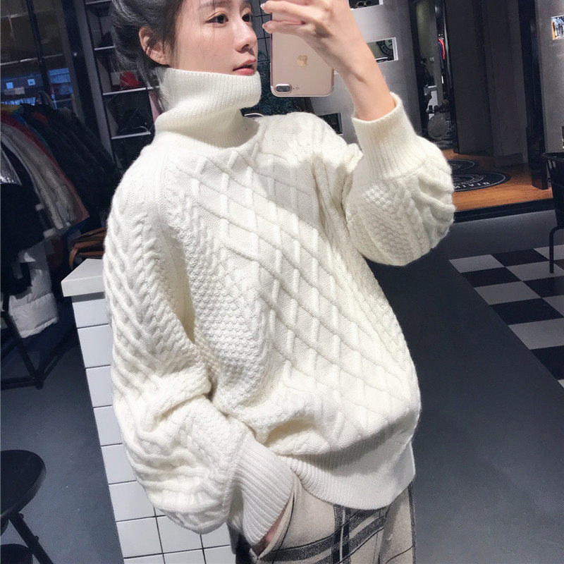 时尚高领毛衣女套头秋冬新款宽松慵懒风复古麻花粗毛线衣外套加厚
