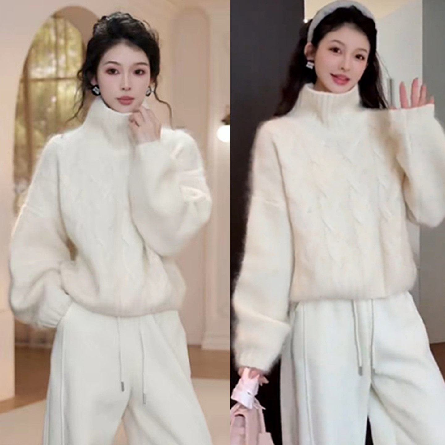 马海毛套头毛衣女秋冬新款温柔风宽松高领加厚外穿麻花针织衫上衣