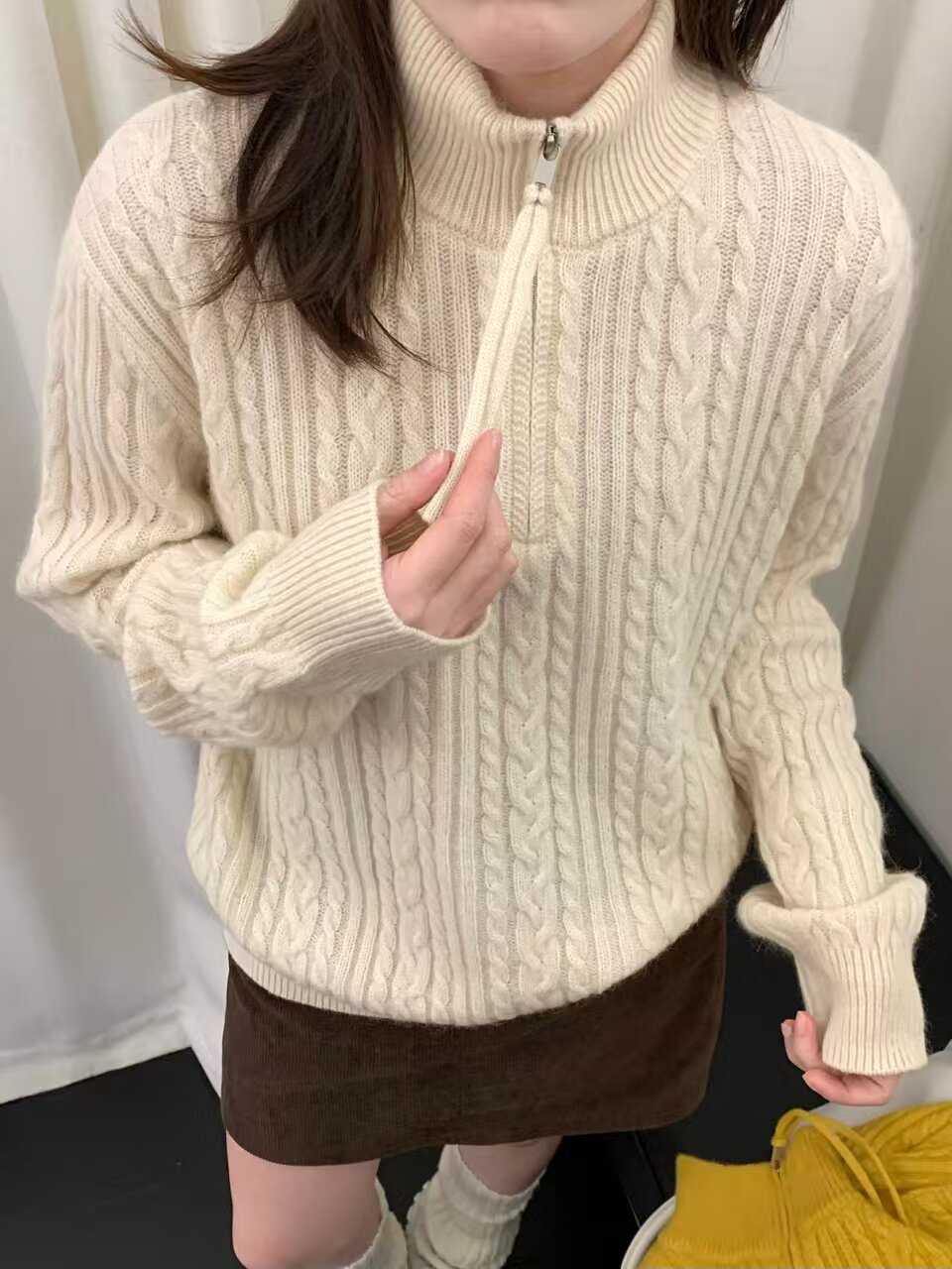 草莓跳 半高领羊毛拉链麻花毛衣女冬季亲肤保暖宽松显瘦套头上衣