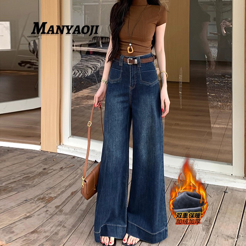 one more文墨阔腿牛仔裤女秋冬季2025新款小个子加绒厚直筒裤子Y