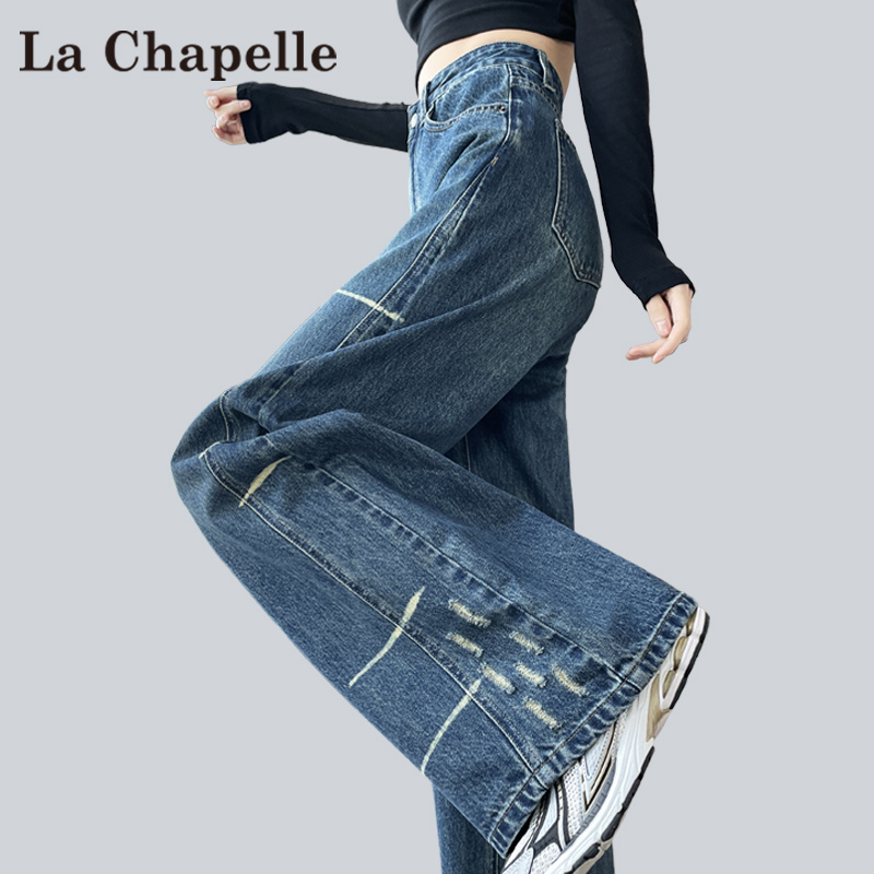 拉夏贝尔复古阔腿牛仔裤女秋冬加绒高腰宽松显瘦设计感直筒拖地裤
