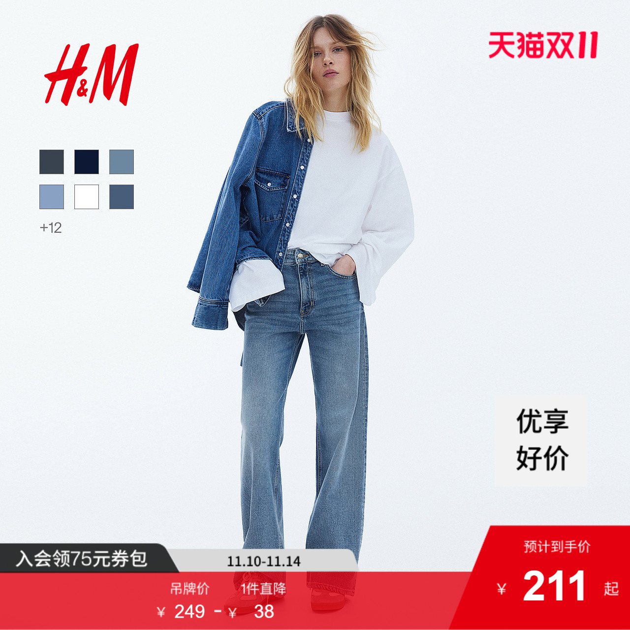 【博主推荐】HM女装牛仔裤通勤高腰水洗裤慵懒阔腿长裤1045459