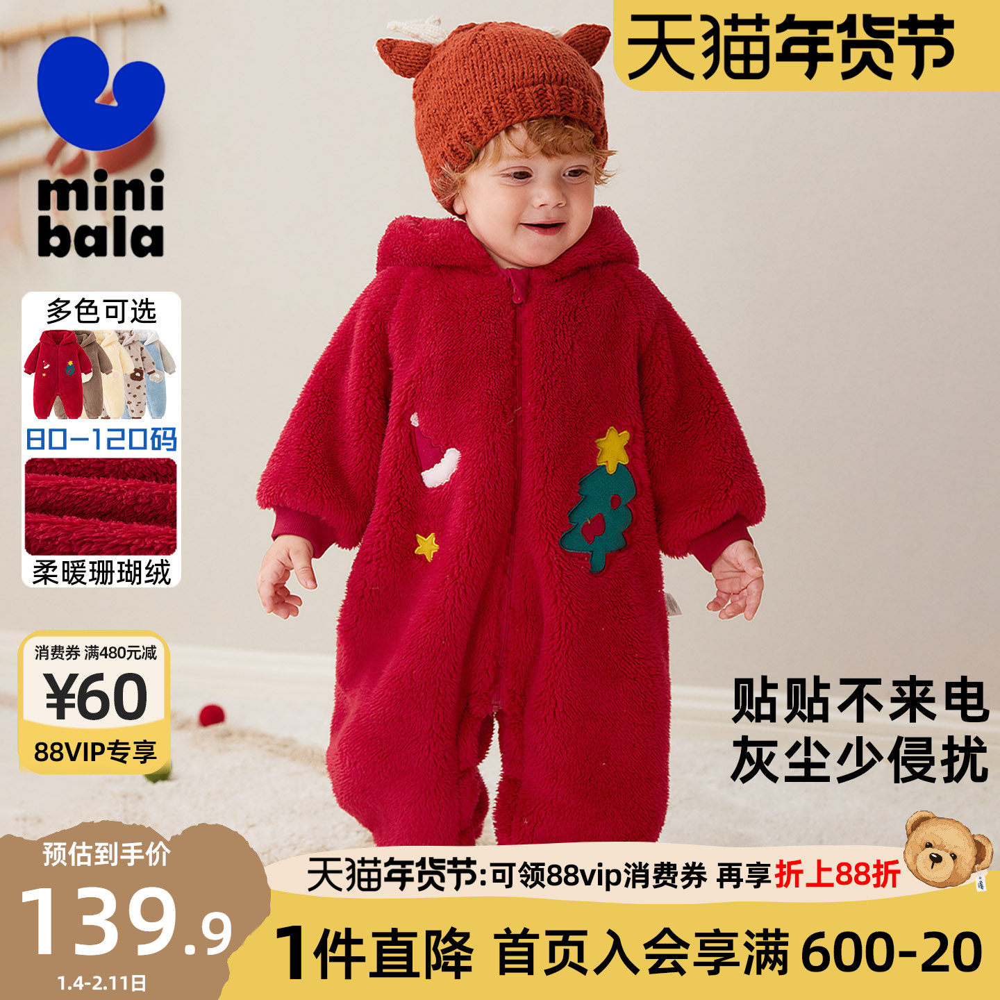 迷你巴拉巴拉婴儿衣服宝宝睡衣家居保暖珊瑚绒红色新年连体衣爬服