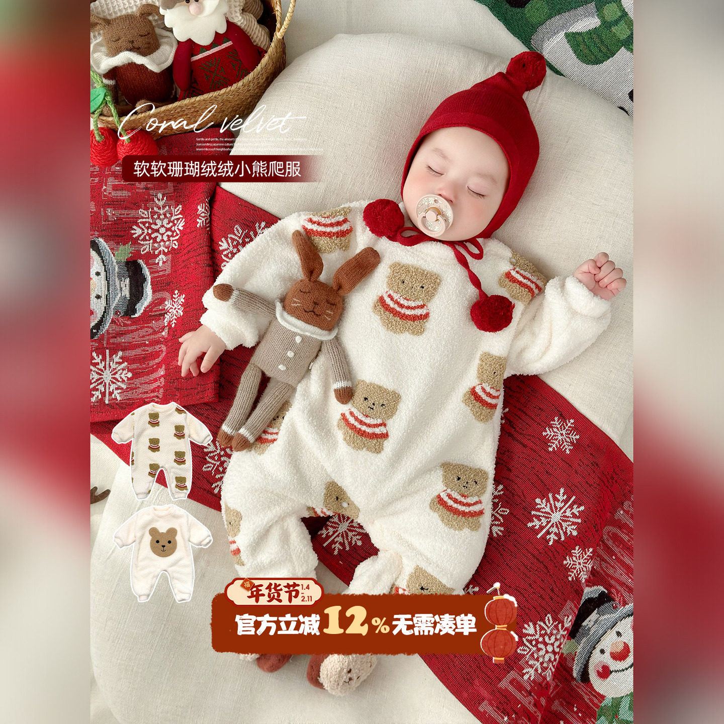 婴儿家居服珊瑚绒连体衣新生儿小月龄宝宝冬装小熊睡衣爬爬服超萌