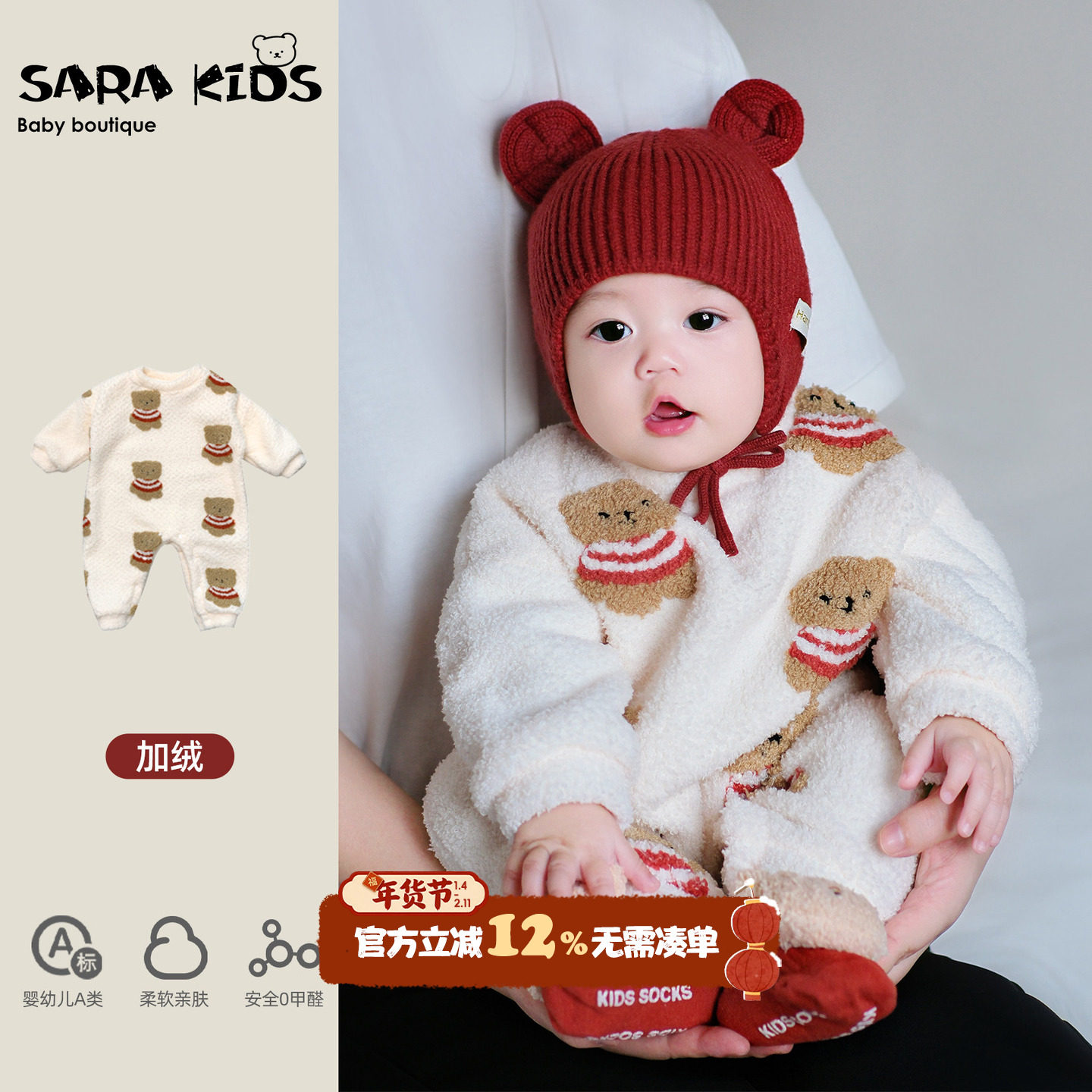 婴儿珊瑚绒连体衣宝宝冬装毛绒家居服宝宝保暖睡衣可外穿小熊爬服
