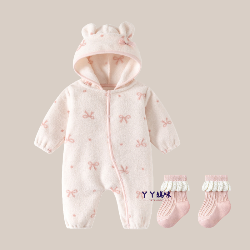 新生儿连体衣秋冬珊瑚绒连帽爬服初生女婴儿满月百天外出保暧抱衣