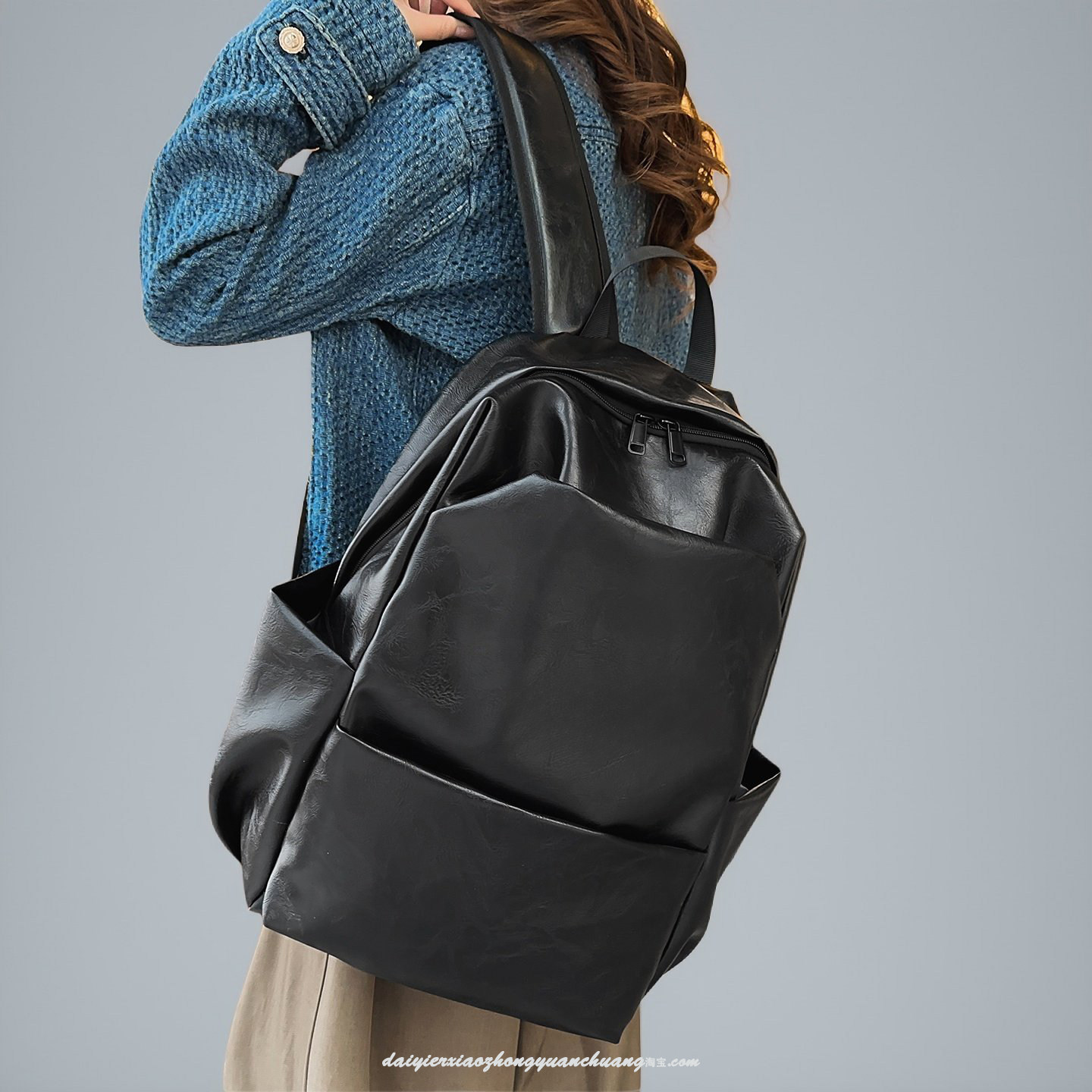 书包女PU防水设计感双肩包百搭小众大学生背包大容量纯色电脑包男