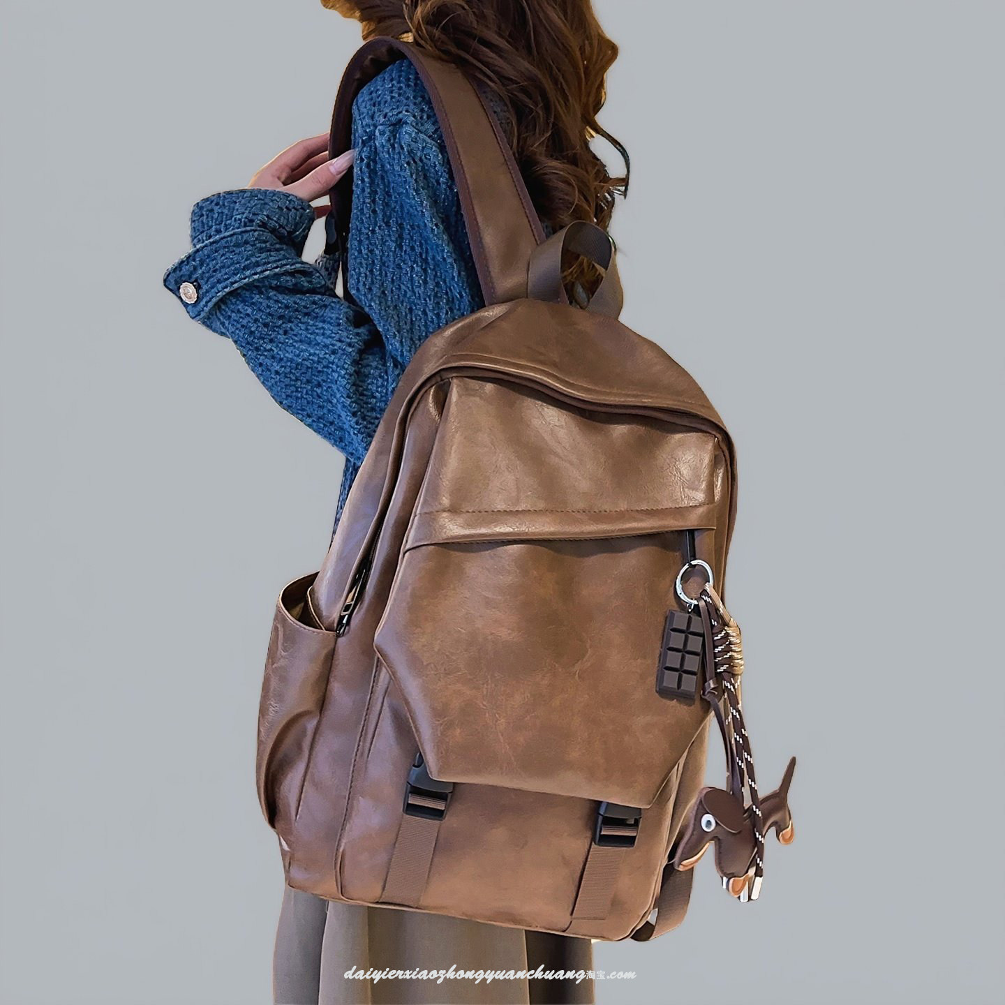 廿下复古双肩包学院风百搭背包女学生书包PU皮大容量电脑旅行包