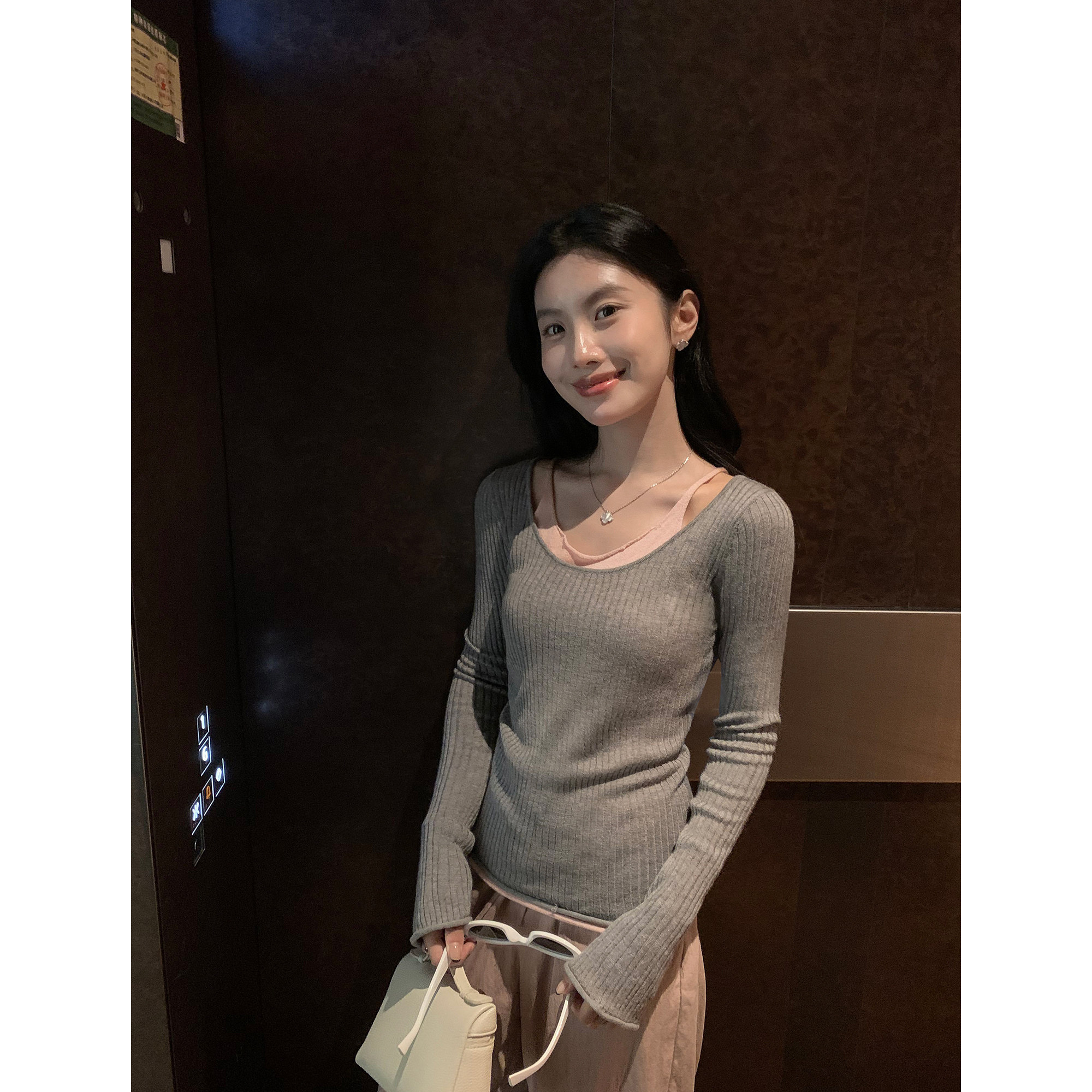 挂脖一字领露肩针织衫女秋冬季纯欲修身毛衣打底内搭灰色格雷上衣