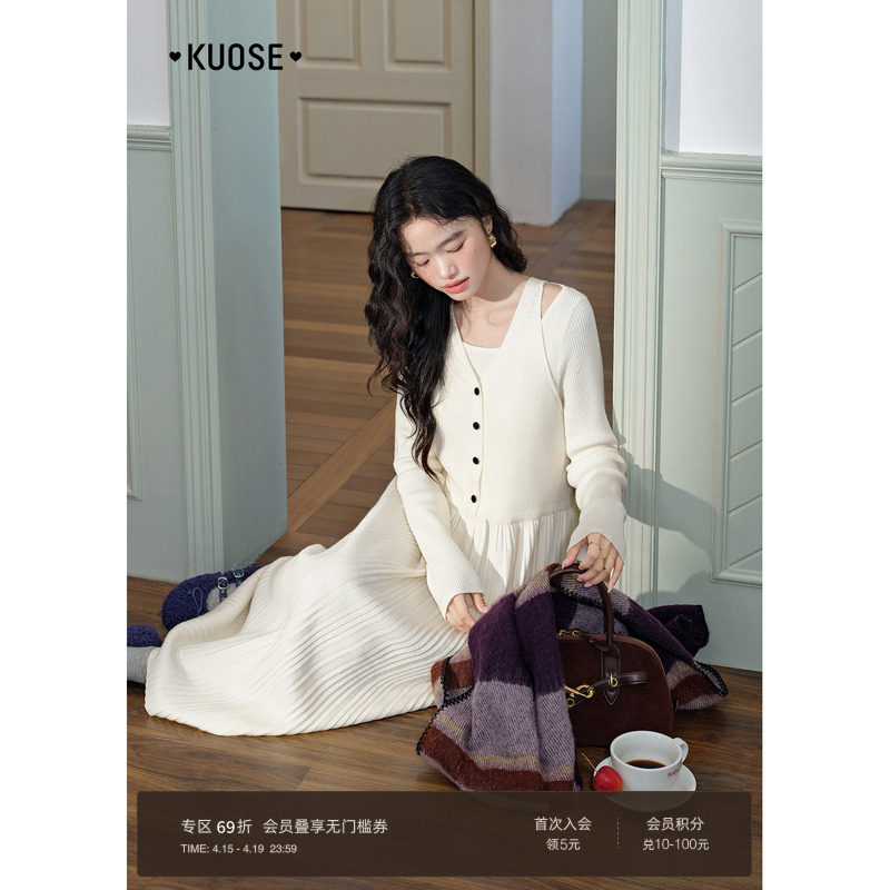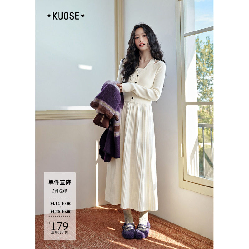 阔色挂脖假两件长袖连衣裙内搭裙25秋冬季新女毛衣裙温柔长裙子春