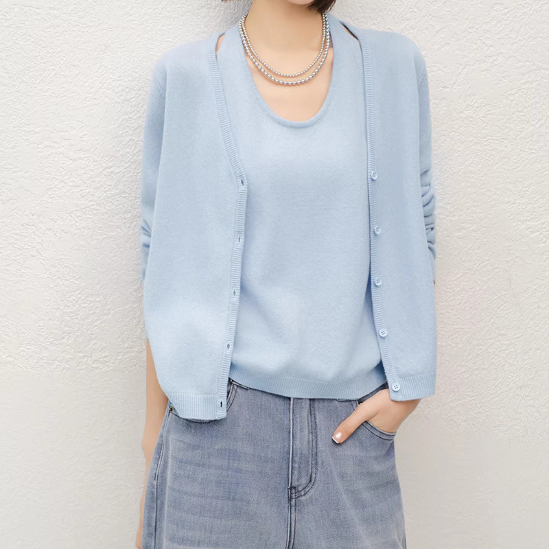 MULVAN 【现货7折】软糯v领毛衣开衫外套女挂脖吊带半身裙套装
