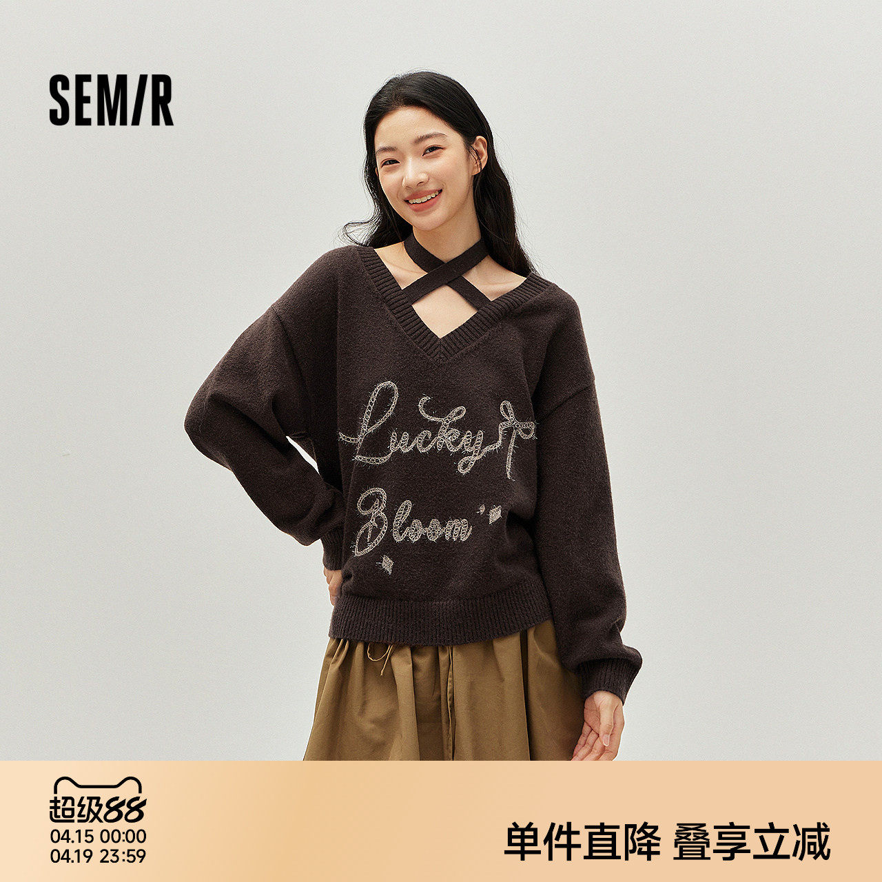 森马毛衣女冬季V领挂脖宽松刺绣蝴蝶结2025新款盐甜系设计感上衣