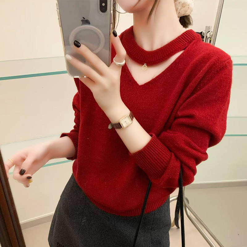 2026新款法式温柔风V领挂脖镂空红色高级感毛衣针织衫上衣女
