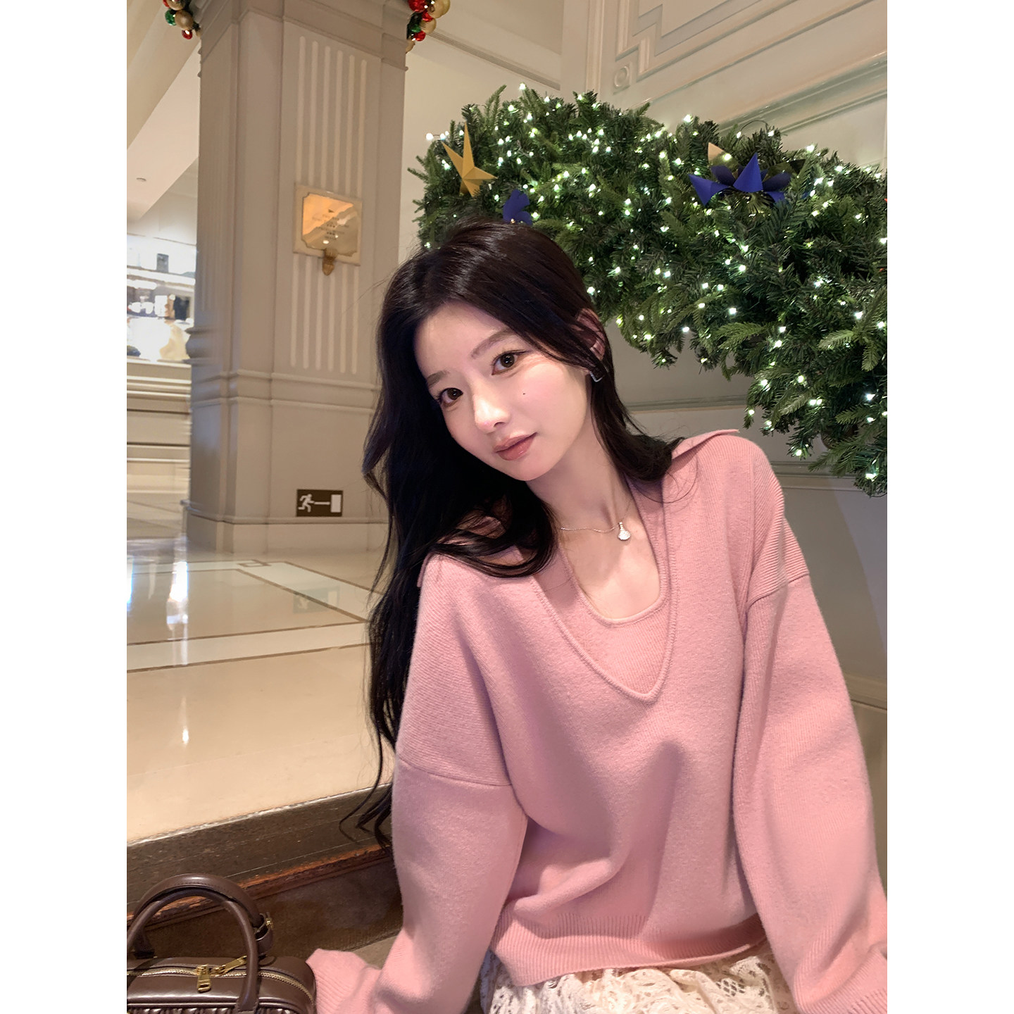 慵懒风V领玫瑰花飘带挂脖针织衫女2026宽松显瘦长袖气质百搭毛衣