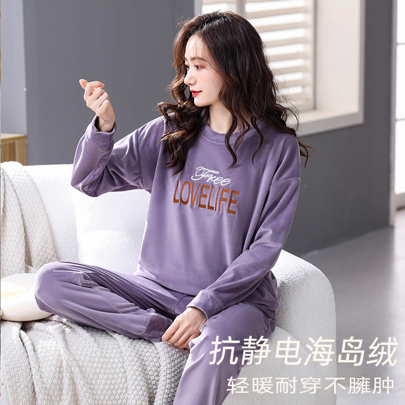 秋冬季珊瑚绒睡衣女款薄款加绒套头可外穿保暖海岛绒加大码家居服
