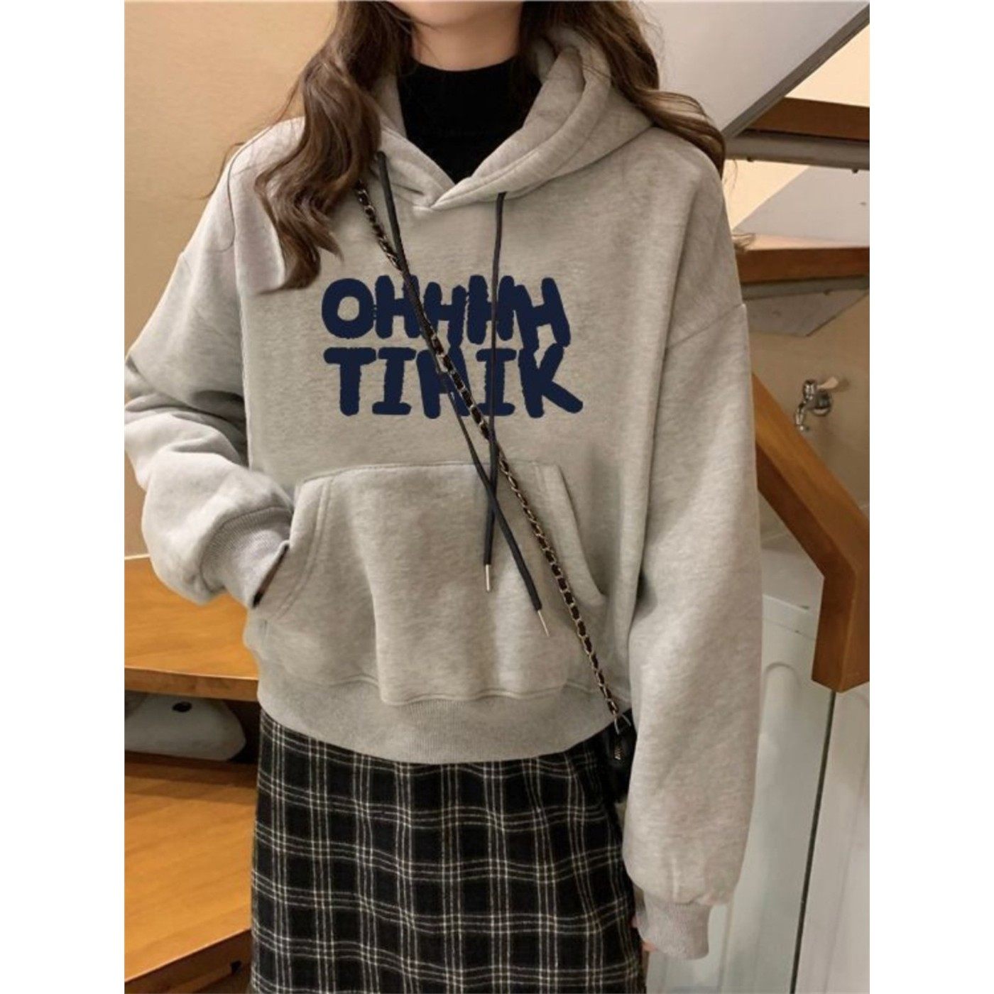 华夫格短款连帽卫衣女学生韩版秋冬新款设计感宽松慵懒风上衣外套