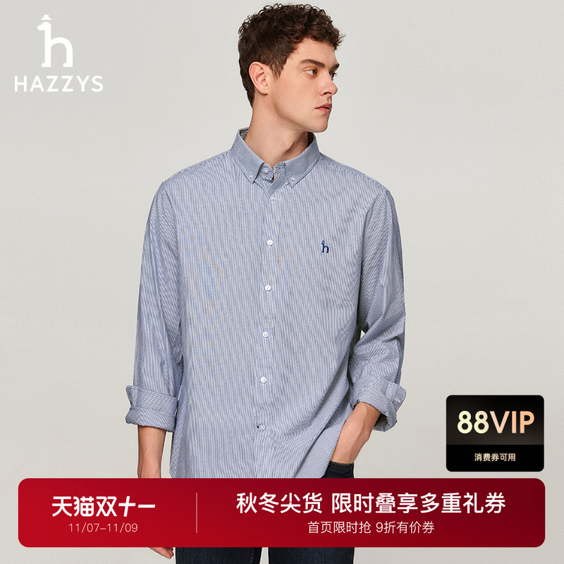 【低调条纹】Hazzys哈吉斯秋季男士长袖衬衫休闲修身竖条纹衬衣男