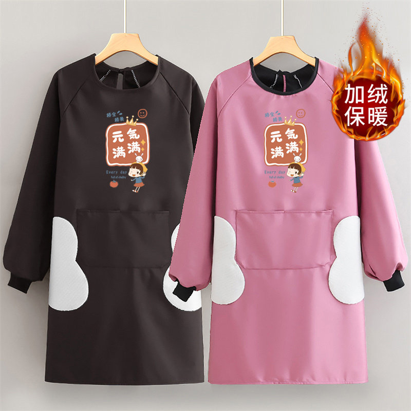 加绒罩衣女新款大人防水加厚厨房防油工作服保暖围裙长袖外套冬季
