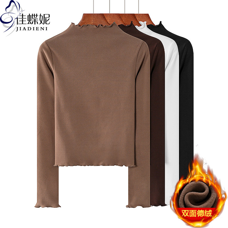 春秋新款荷叶边半高领修身纯色短款纯欲德绒长袖体恤上衣女打底衫