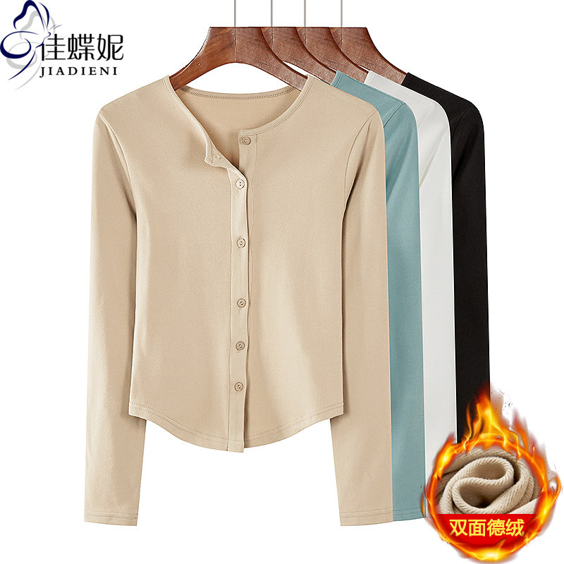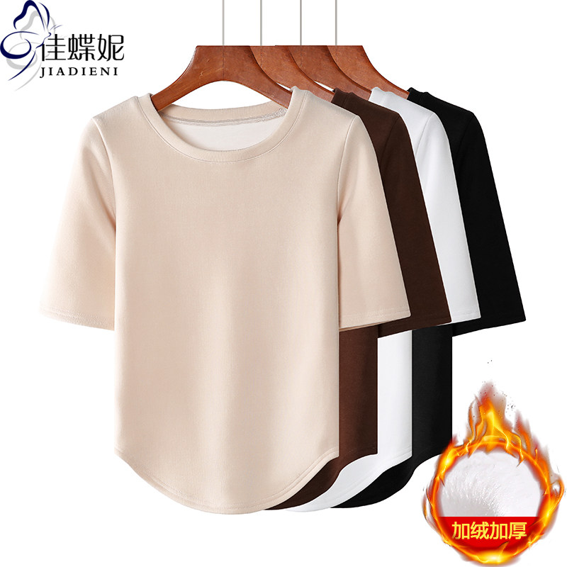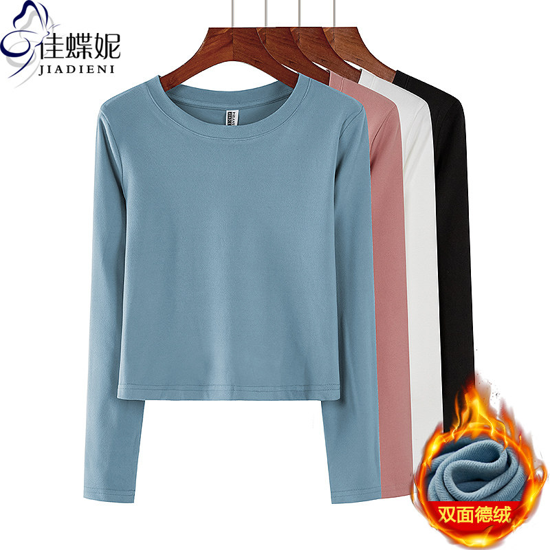 秋冬新款圆领修身短款纯欲双面德绒保暖纯色长袖体恤上衣女打底衫