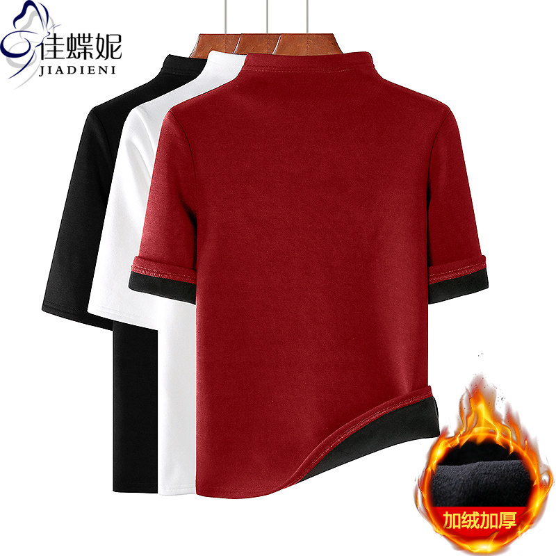 冬季新款韩版圆领修身显瘦纯色保暖加绒加厚中袖体恤上衣女打底衫