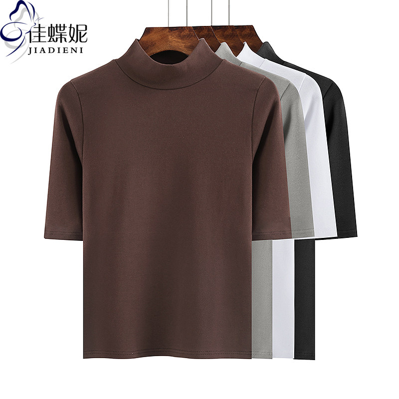 春秋新款高领修身显瘦纯棉纯色简约中袖体恤上衣女打底衫内搭半袖