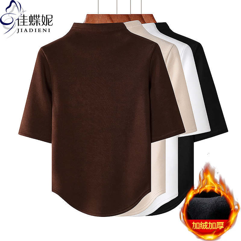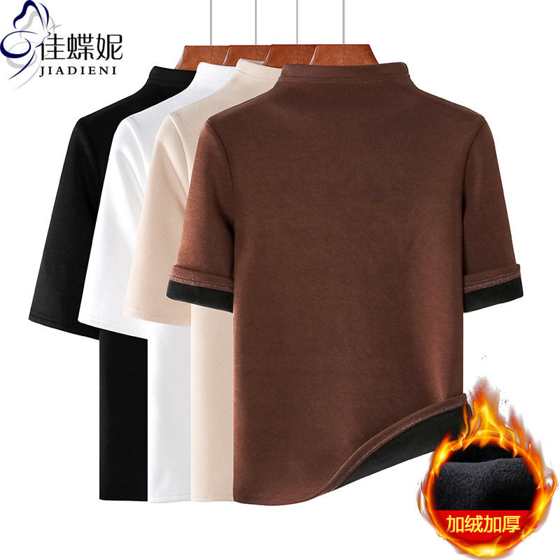 秋冬新款半高领修身短款纯欲纯色高腰德绒保暖长袖体恤上衣女打底