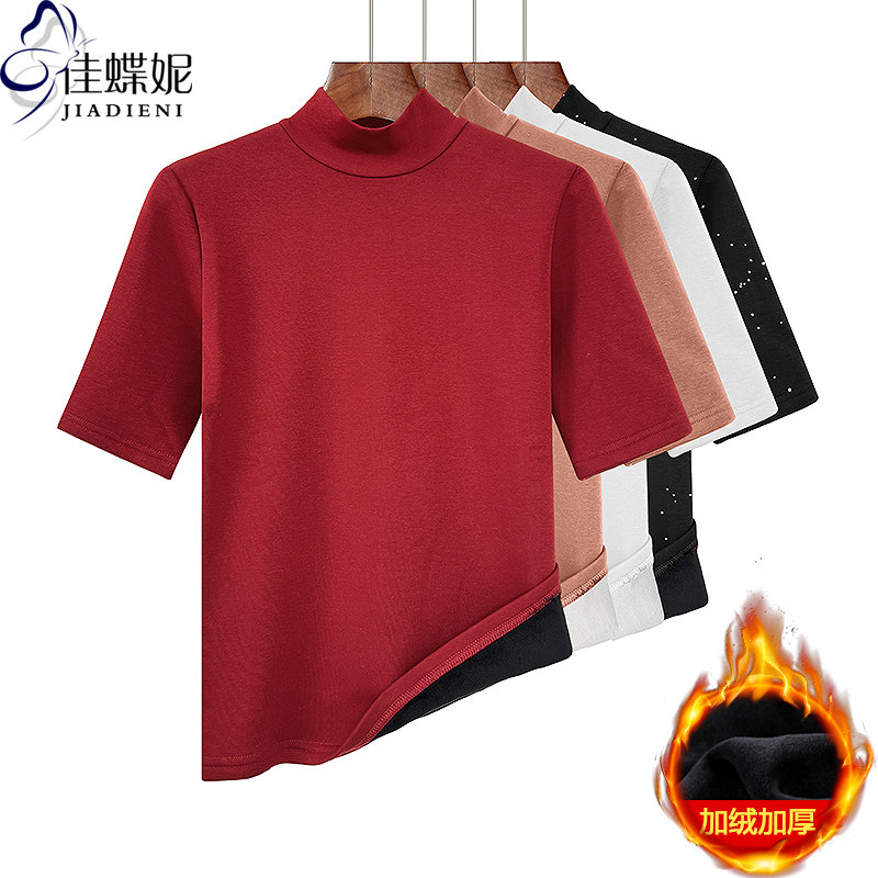 冬季新款半高领修身纯色加绒保暖加厚圆弧纯欲中袖体恤上衣女打底