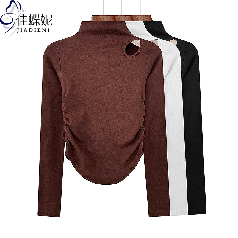春秋新款半高领修身显瘦纯欲纯色纯棉镂空褶皱长袖体恤上衣女打底