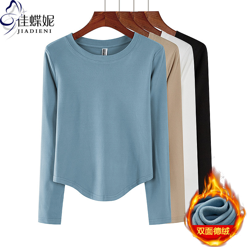 秋冬新款圆领修身纯欲圆弧下摆双面德绒保暖长袖体恤上衣女打底衫