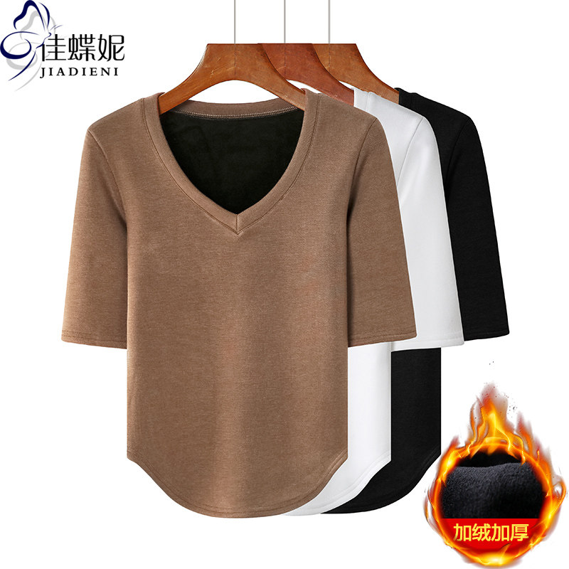 秋冬新款韩版V领修身加绒加厚保暖纯色中袖体恤上衣女内搭打底衫
