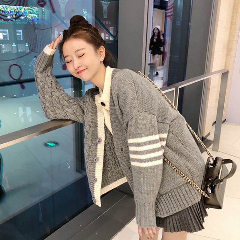 条纹毛衣女学生韩版秋冬新款圆领宽松百搭显瘦软糯纽扣针织开衫女