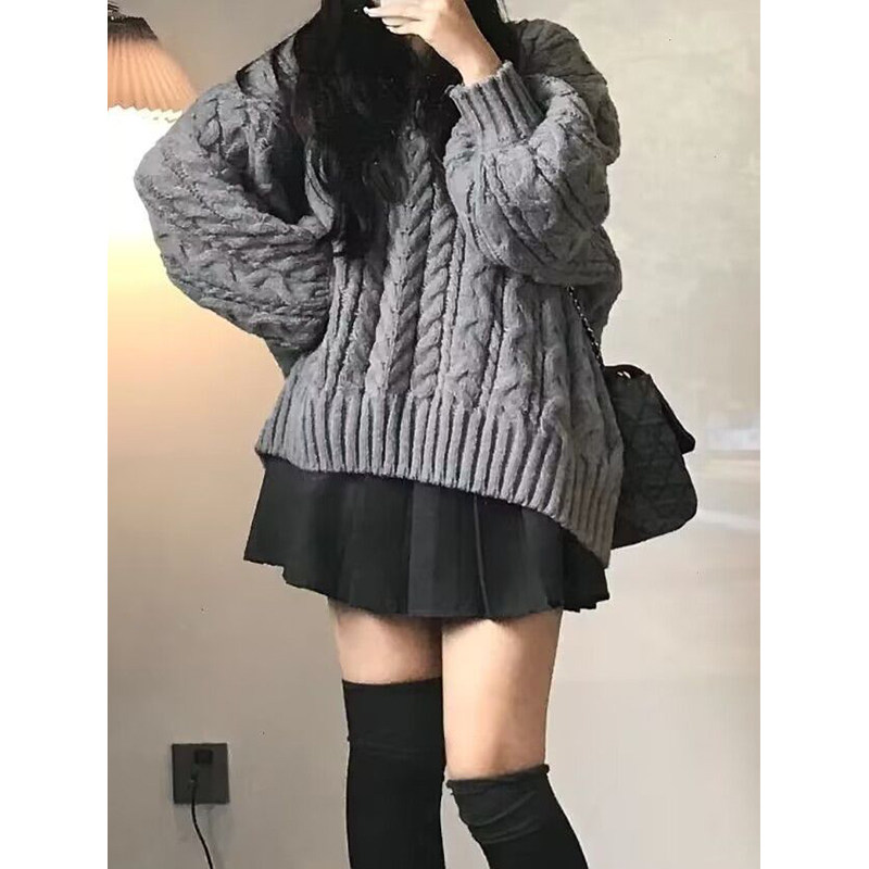 慵懒风复古加厚V领宽松灰色麻花毛衣女学生秋冬韩版百搭针织衫潮