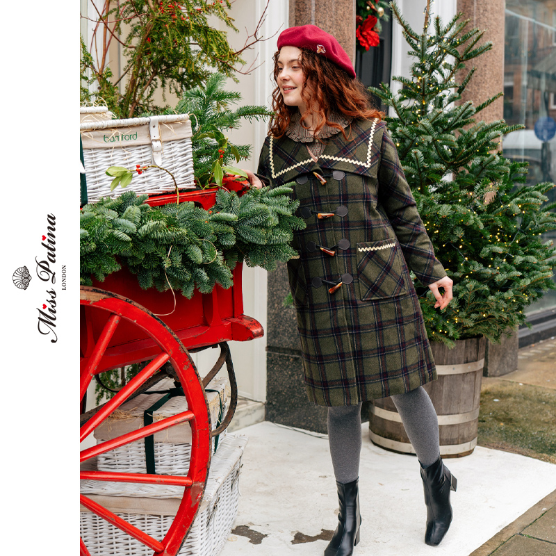 DOLL原创 【芬兰童话】娃娃领中长款格子呢大衣女冬宽松毛呢外套