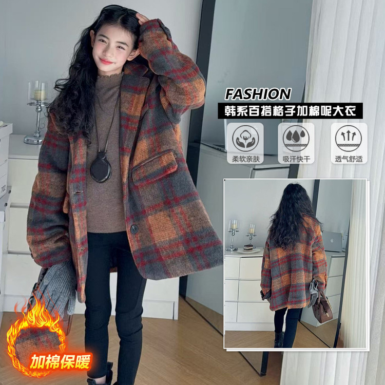 8856女童格子呢大衣冬装毛呢外套翻领夹棉中长款2024新款洋气学院