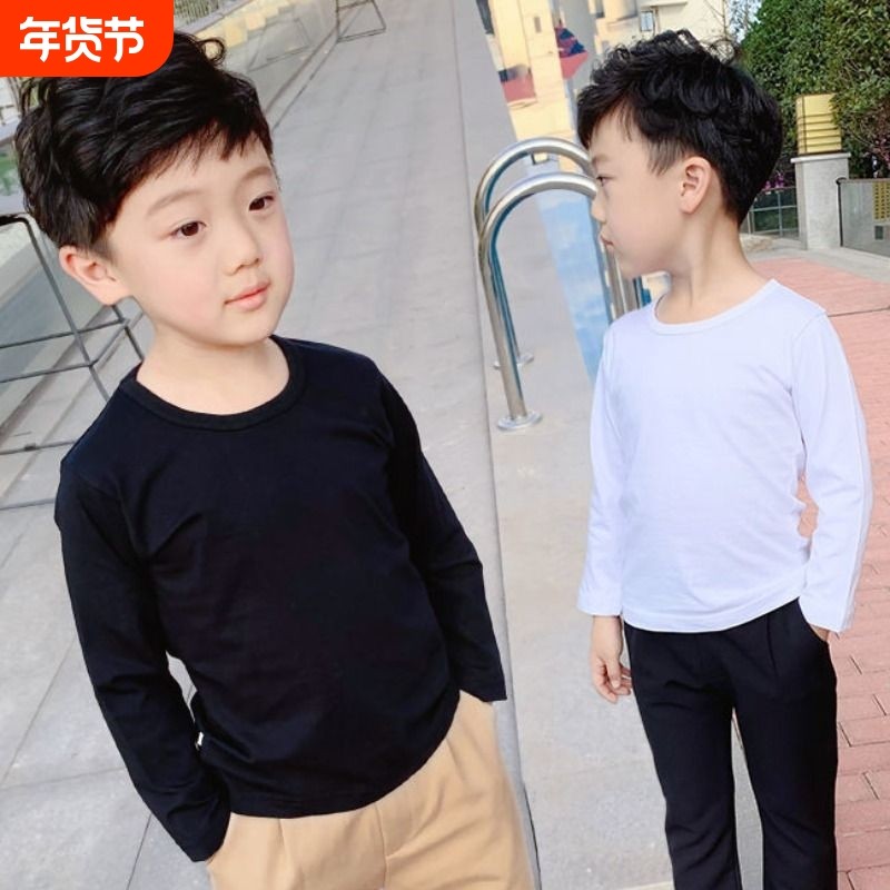 儿童长袖T恤中大男童装新款小童白色纯黑色圆领长袖t恤打底衫全棉