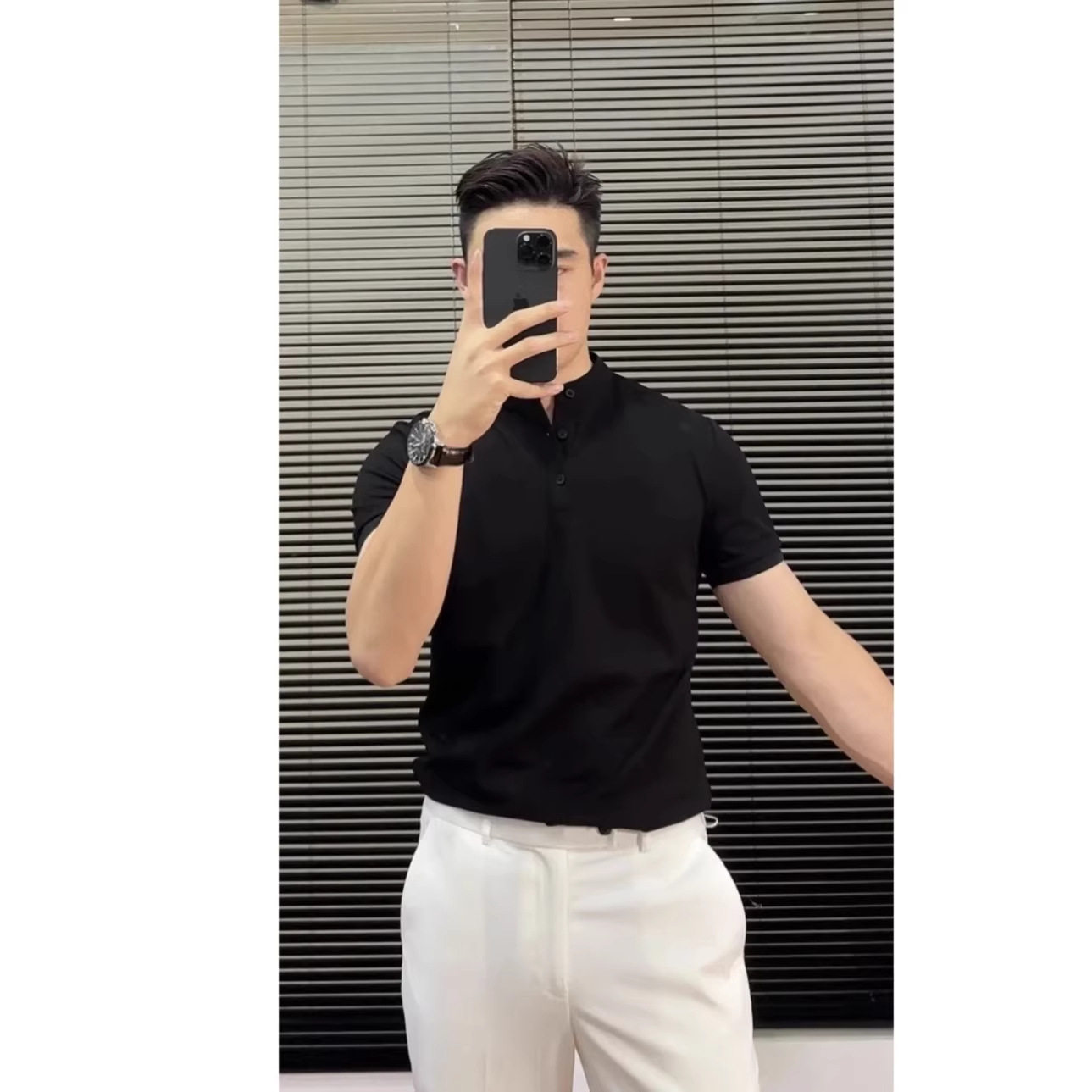 纯黑色美式正肩短袖polo衫男士穿搭一整套高级感亨利领t恤显肌肉