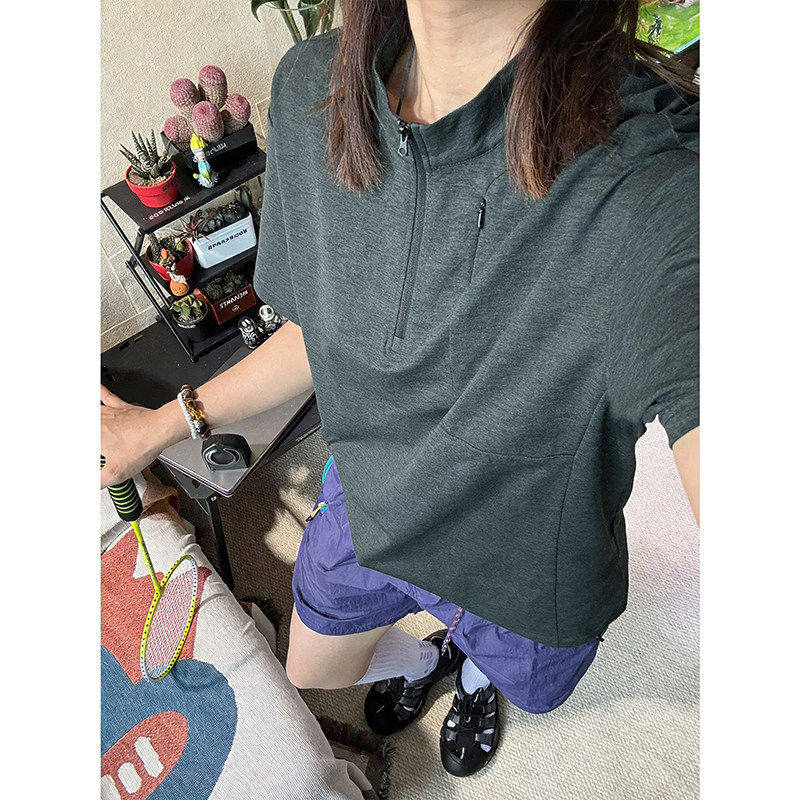 2026夏季新款吸湿排汗迪桑棉短袖T恤高级感痞帅纯黑色半拉链男装