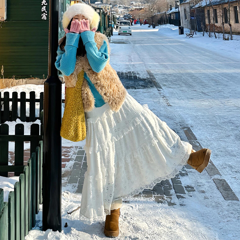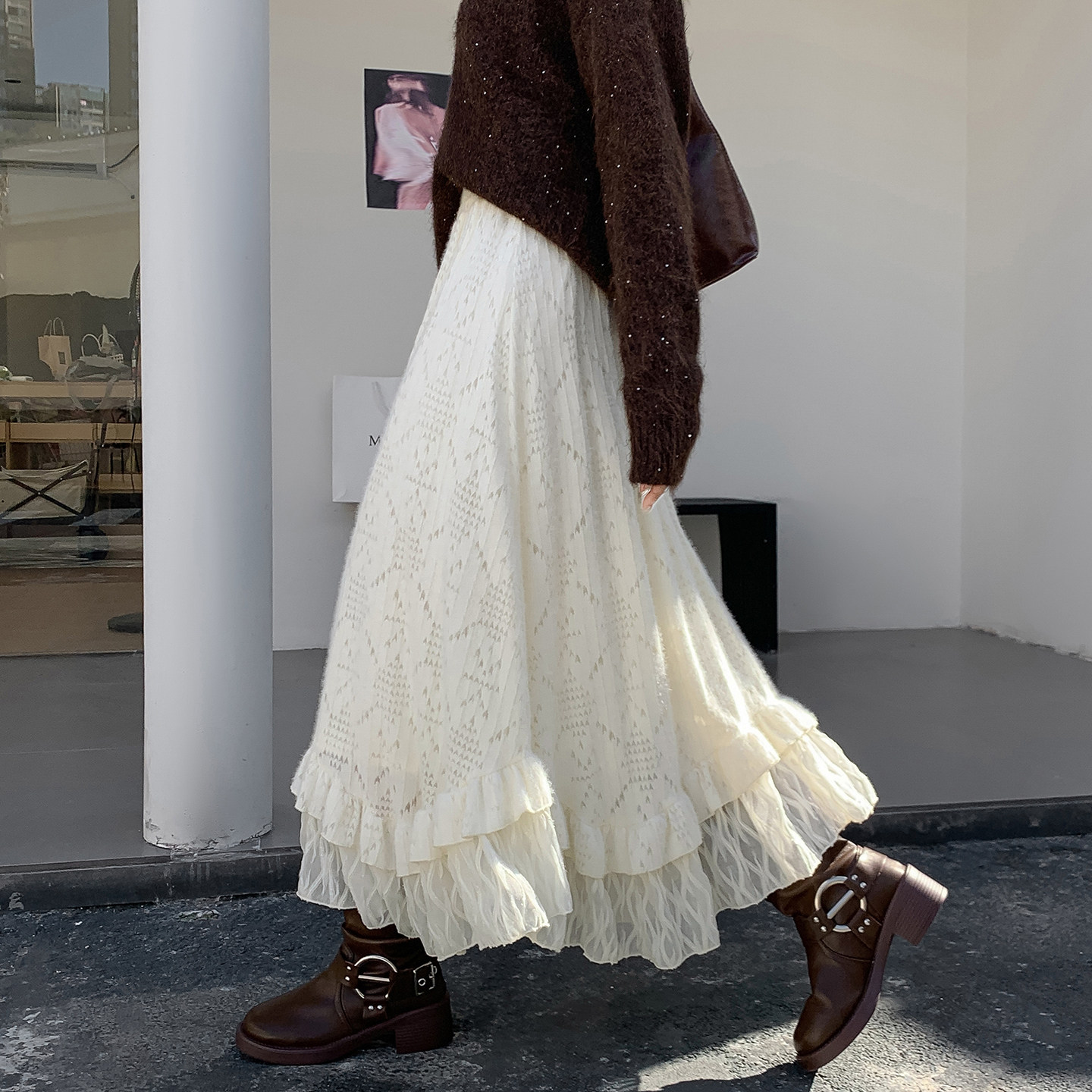 白色蕾丝蛋糕裙女秋冬季加绒新款高腰休闲小个子中长款a字半身裙