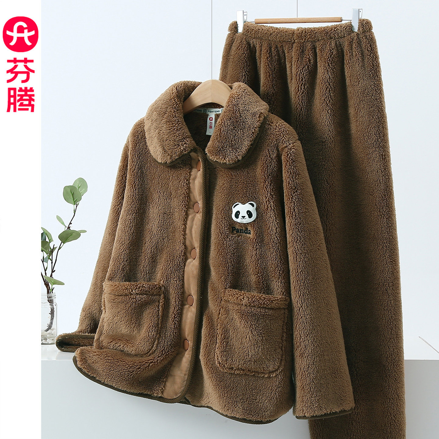 芬腾卡通熊猫珊瑚绒睡衣女秋冬款加绒加厚翻领外穿家居服套装2025